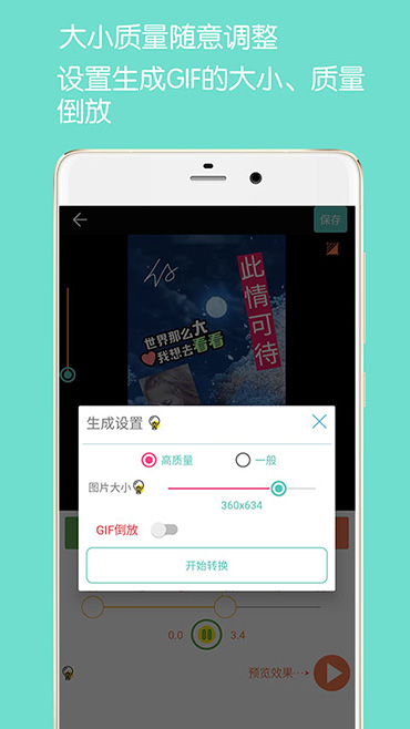 這不是簡單的轉(zhuǎn)GIF,在制作的過程中你可以隨意添加你想要的圖片,藝術文字,gif,表情到GIF中的任意位置和設置任意時間顯示。你還可以調(diào)節(jié)GIF生成的像素大小,控制幀的播放速度(變快變慢),從而控制GIF的體積大小。